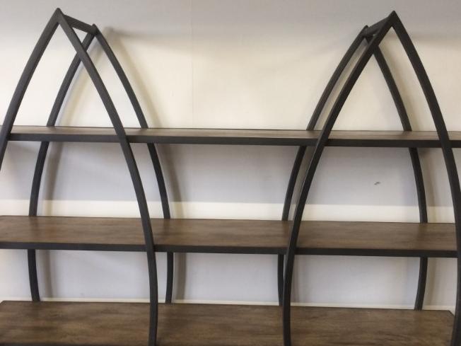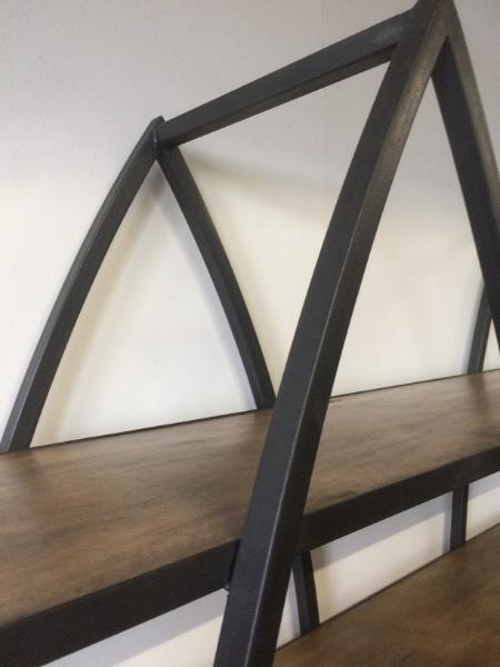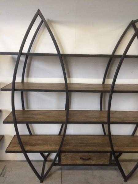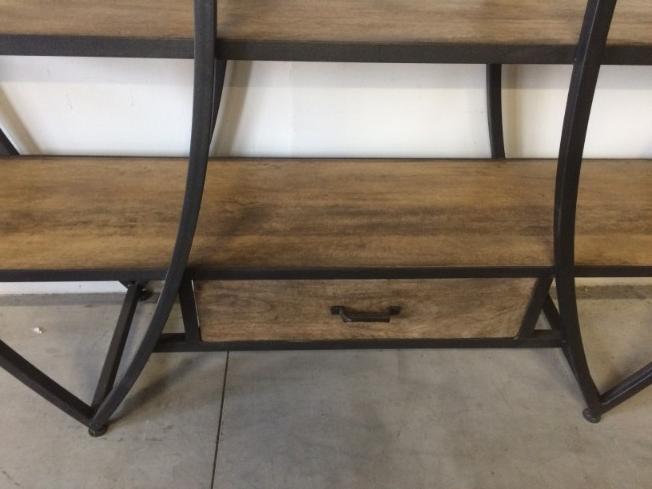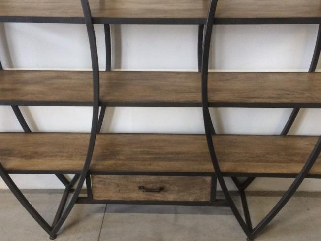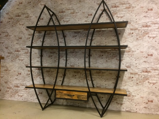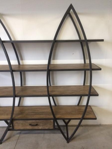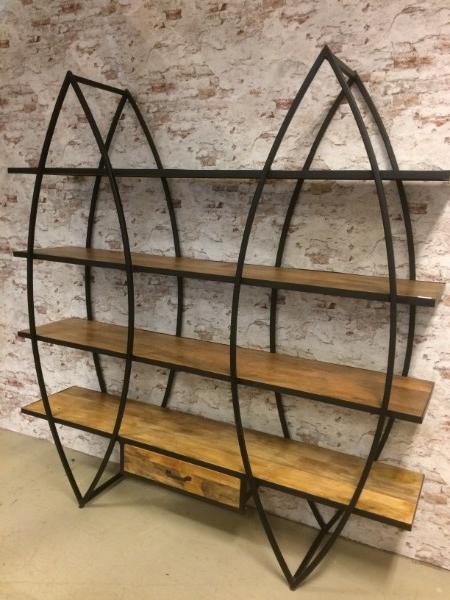 Boekenkast met een zwart metalen frame en mango houten schappen, onderin zit een lade.