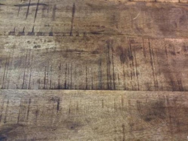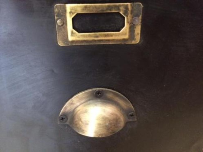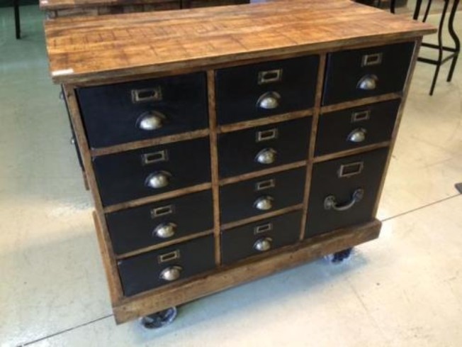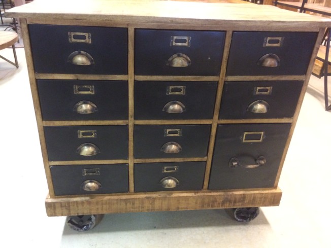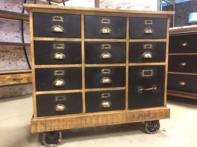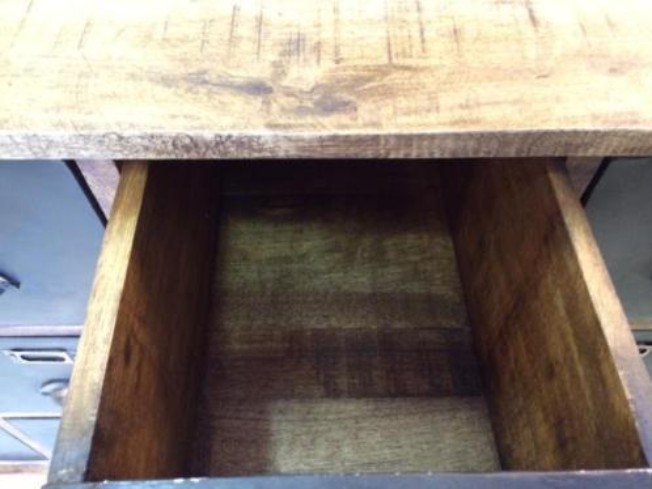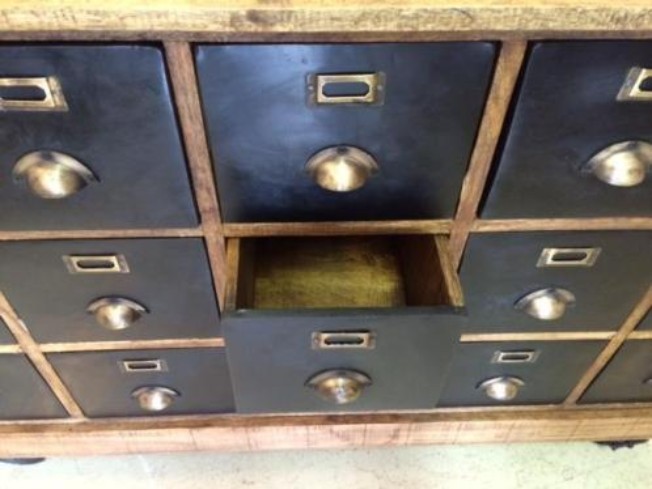 Dressoir van mango hout met 11 laden, de laden zijn bekleed met zwart metaal.