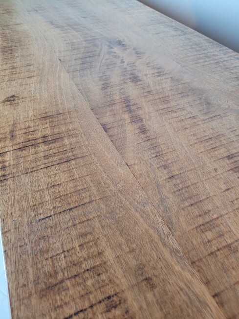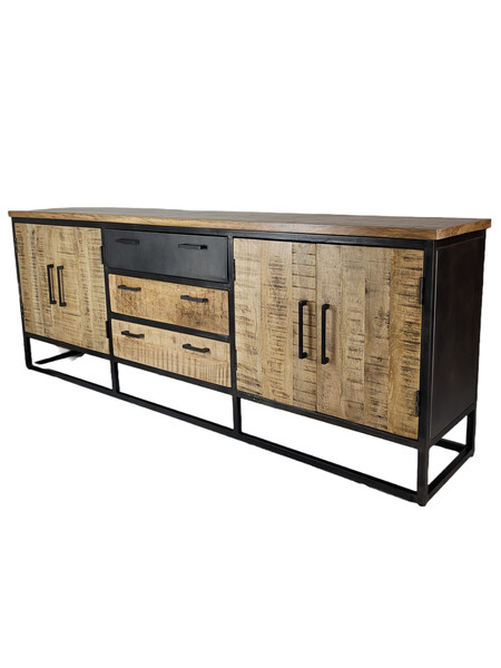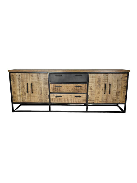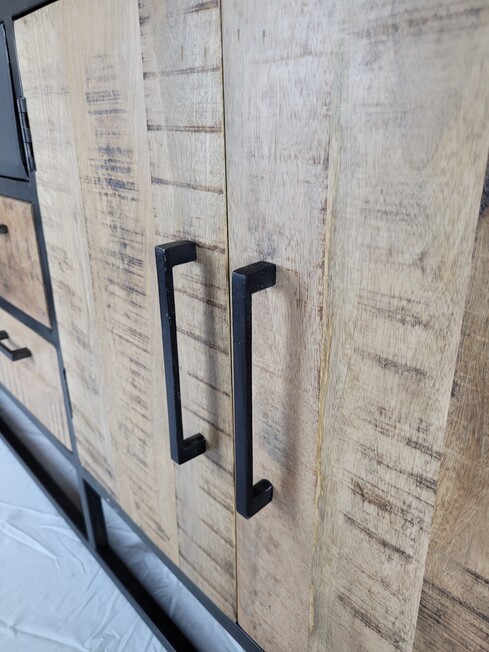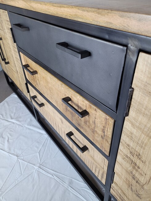 Industrieél dressoir van metaal gecombineerd met blank mangohout. Dit dressoir is van zwart gespoten metaal, de lades, deurtjes en de schappen zijn van mangohout. Het mangohout is naturel van hout en een ware eyecatcher.