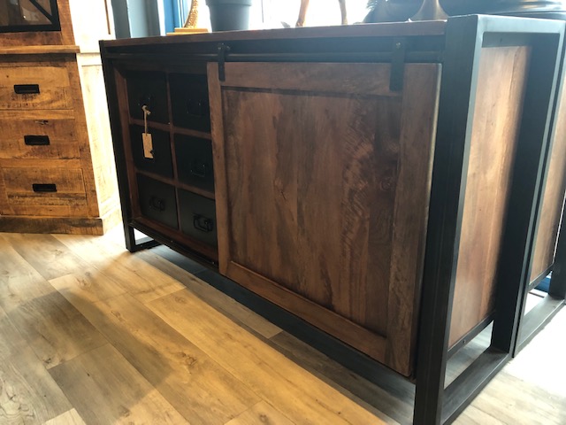 Dit dressoir is gecombineerd met zwart metaal en blank mangohout.