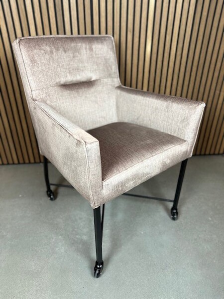 Deze luxueuze Eetkamerstoel op wieltjes is verkrijgbaar in elke gewenste stof.