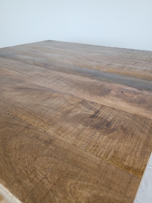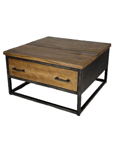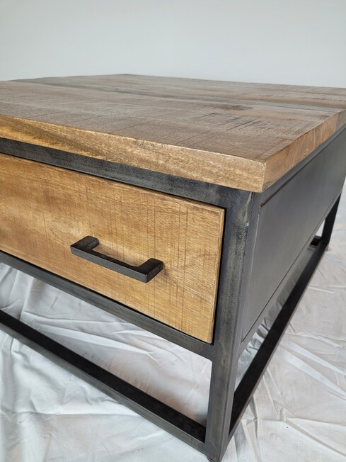 Industriële salontafel in combinatie van blank mangohout. Deze salontafel is van zwart gespoten metaal, de lades zijn van mangohout. Het mangohout is naturel van hout en een ware eyecatcher.
