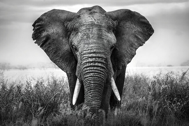 Dit is een prachtig glasschilderij van een olifant in zwart-wit.